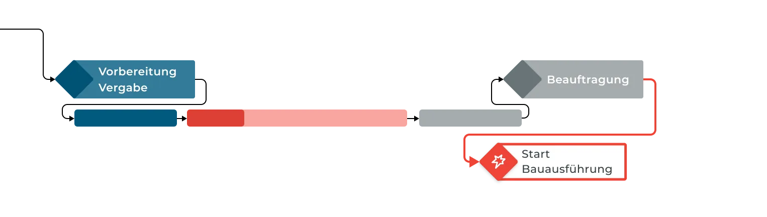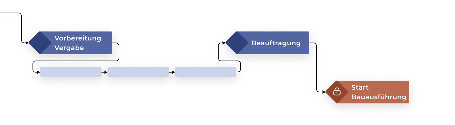 Phasenübergreifende Meilensteine mit Abhängigkeiten helfen Dir dabei, vom Baubeginn rückwärts zu planen und den Start der Vergabephase realistisch zu planen.