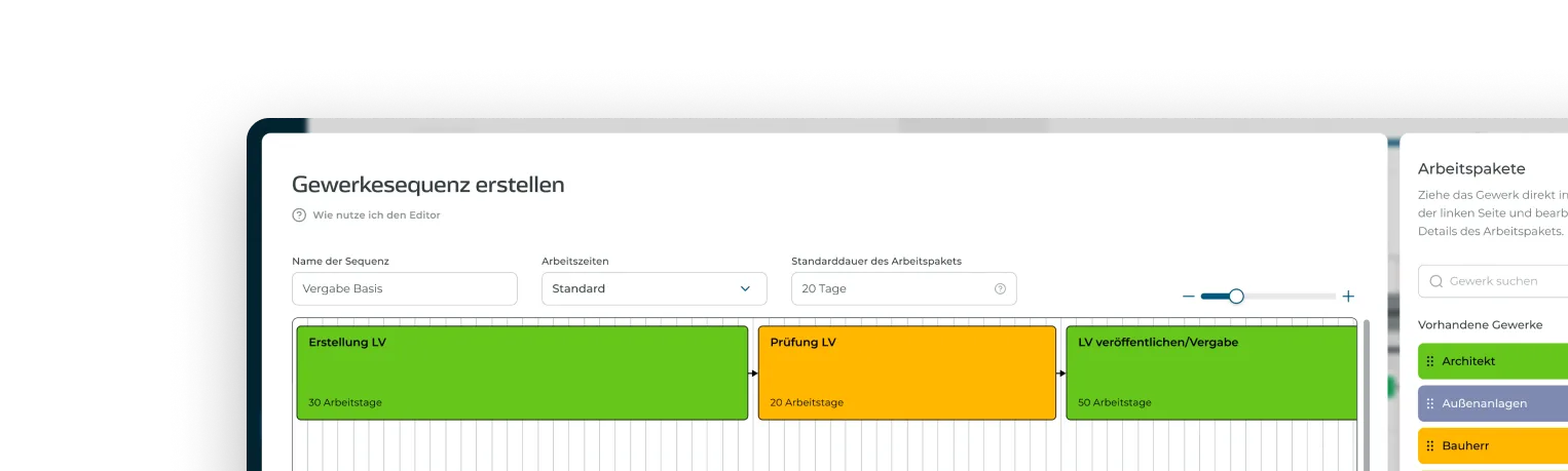 Mit dem Terminplan von koppla kannst Du deine Vergabepakete zuverlässig planen, um einen pünktlichen Baustart sicherzustellen!