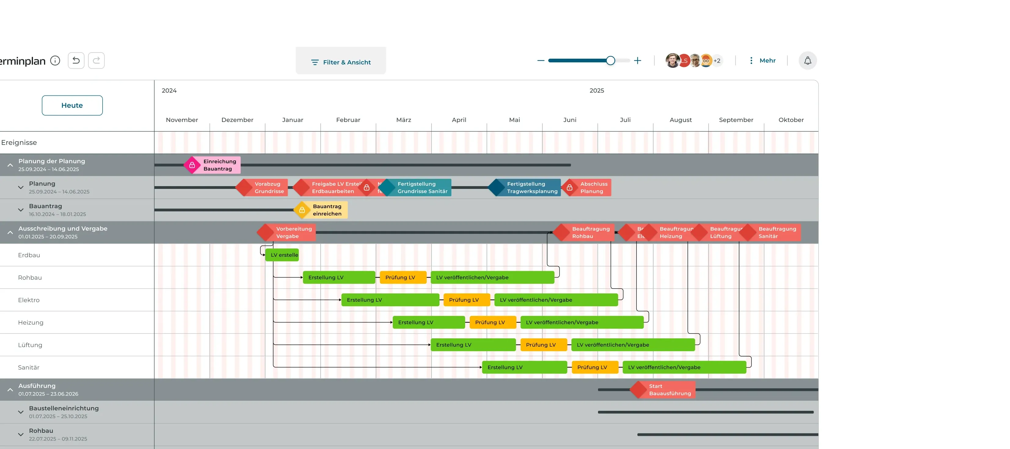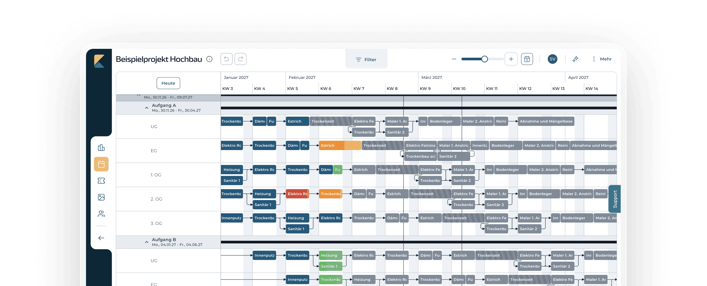 Erkenne auf einen Blick, wo das Projekt nach Plan läuft, welche Vorgänge verzögert sind und wo Handlungsbedarf besteht.