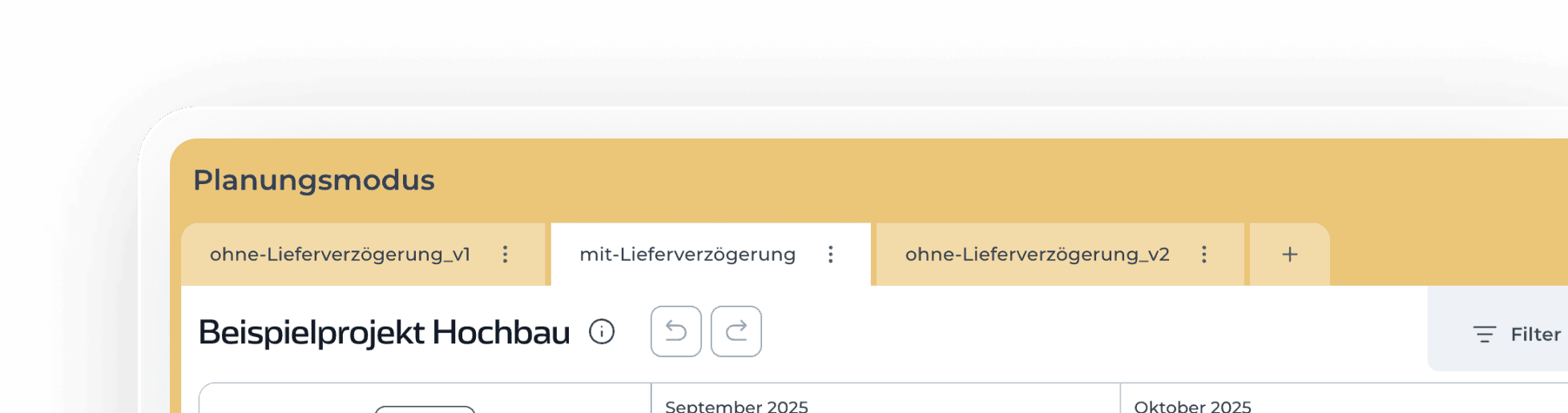 Egal ob Du neue Szenarien durchspielen oder gestörte Bauabläufe lösen möchtest: Im Planungsmodus testest du Varianten deines Terminplans in einer Testumgebung ganz ohne Risiko.