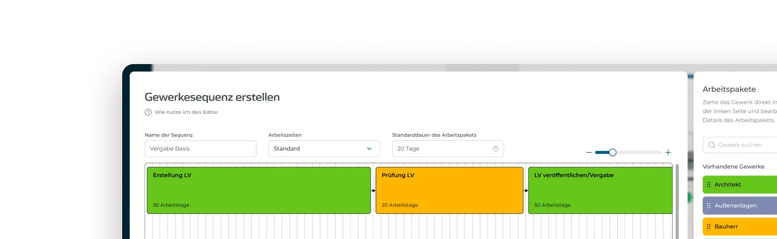 Planst Du mehrfach die gleiche Abfolge von Vorgängen, sparst Du mit Gewerkesequenzen eine Menge Zeit: Du erstellst nur einmal die Abfolge und kannst anschließend alle Gewerkesequenzen im Terminplan auf einmal ändern.