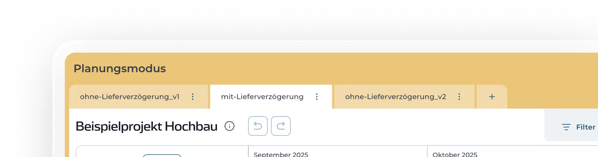 Viele Terminpläne in einem Projekt: Spiele verschiedene Was-wäre-wenn-Szenarien durch, teste neue Varianten deines Terminplans oder erstelle einen groben Bauzeitenplan speziell für den Auftraggeber.