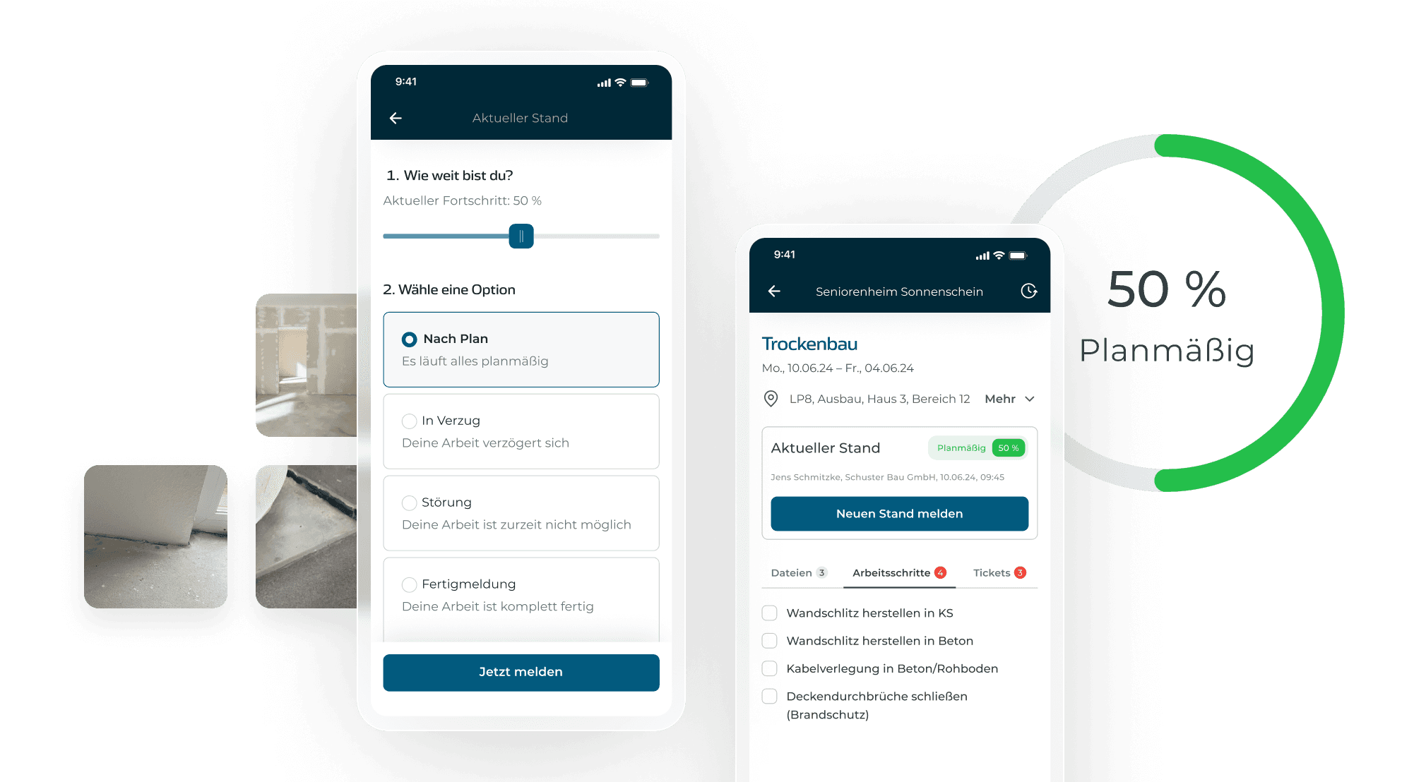 Über die Baustellen-App melden Gewerke ihre Fortschritte oder Verzögerungen von der Baustelle direkt ins Büro, sodass Du immer Bescheid weißt.