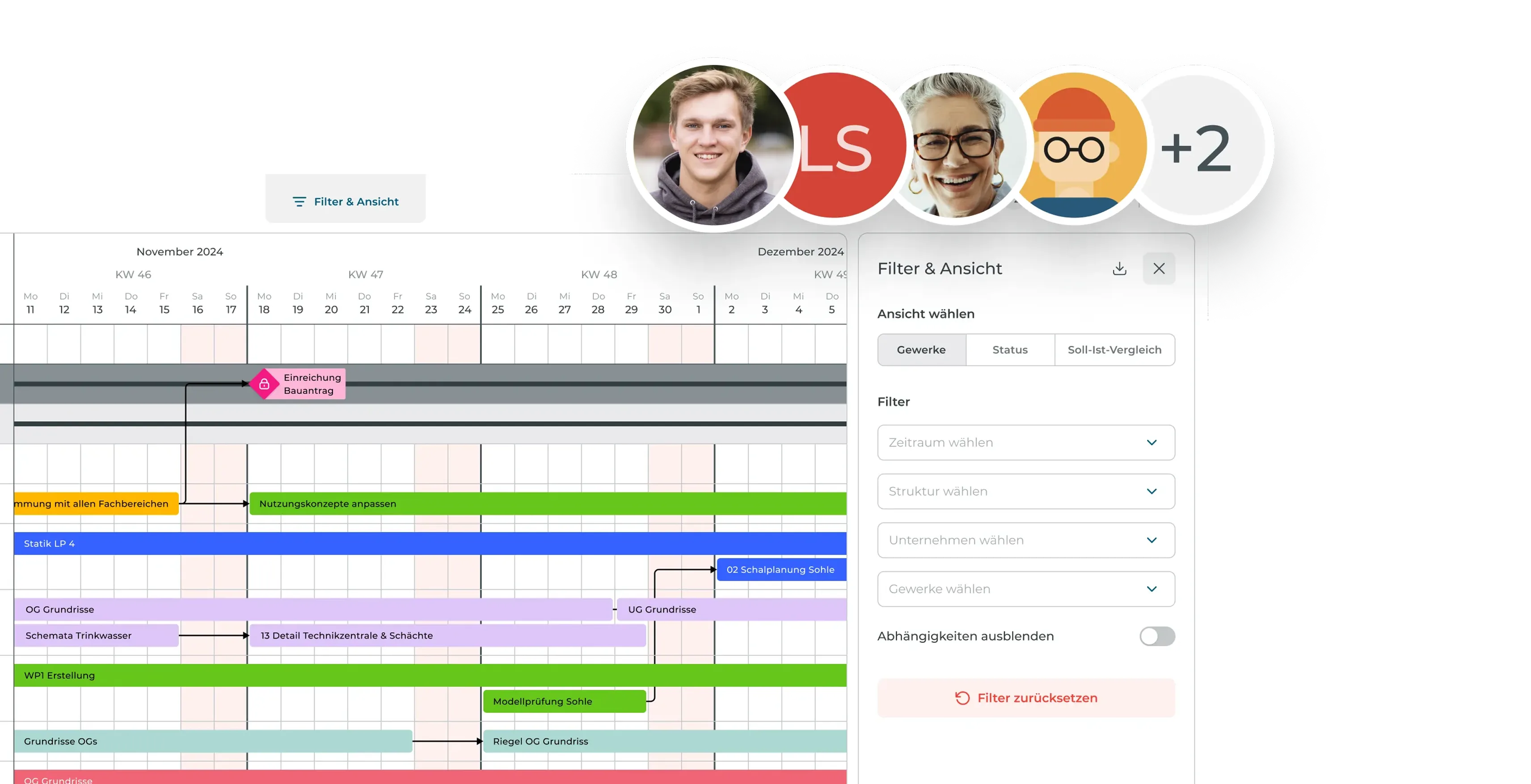 Erkenne und verstehe, wo dein Bauprojekt nach Plan läuft, welche Vorgänge verzögert sind und wo Handlungsbedarf besteht.