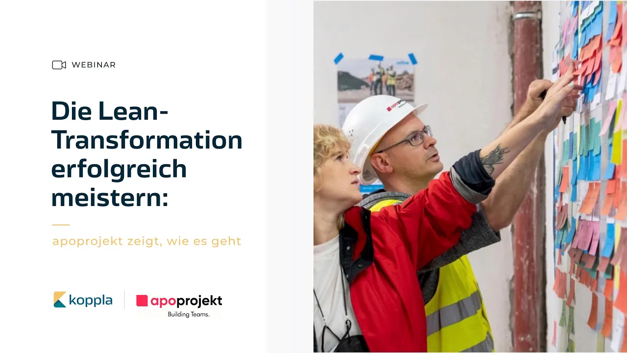 Jerome Lange (CEO und Gründer von koppla) und Sebastian Mantei (Head of Lean Management bei apoprojekt) haben geklärt, wie man Lean als Unternehmen nachhaltig etabliert und in die Breite bringt. Außerdem hat Sebastian verraten, wie apoprojekt es geschafft hat, heute eines der führenden Unternehmen beim Thema Lean zu sein. Denn apoprojekt optimiert nicht nur fast alle Projekte mit Lean, sondern auch alle Prozesse außerhalb der Baustelle.